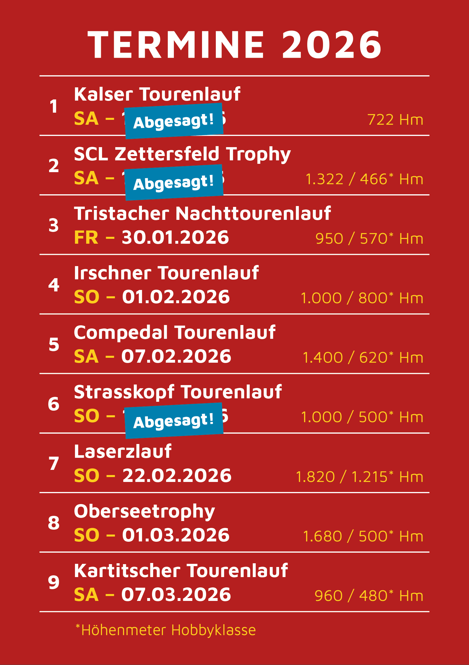 Fällt ein Bewerb aus (schnee-/witterungsbedingt …) oder verändern sich die Höhenmeter aufgrund geänderter Streckenführung, werden die für die Medaillen zu erreichenden Höhenmeter neu angepasst!
